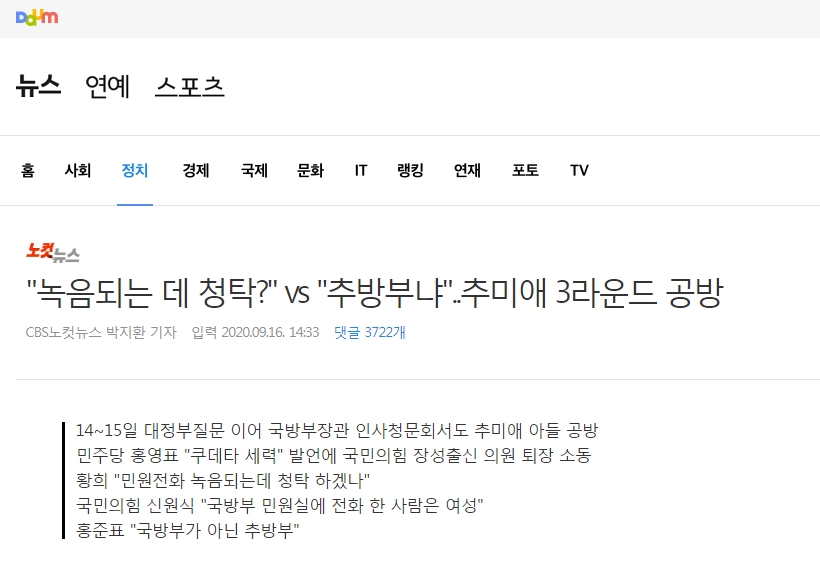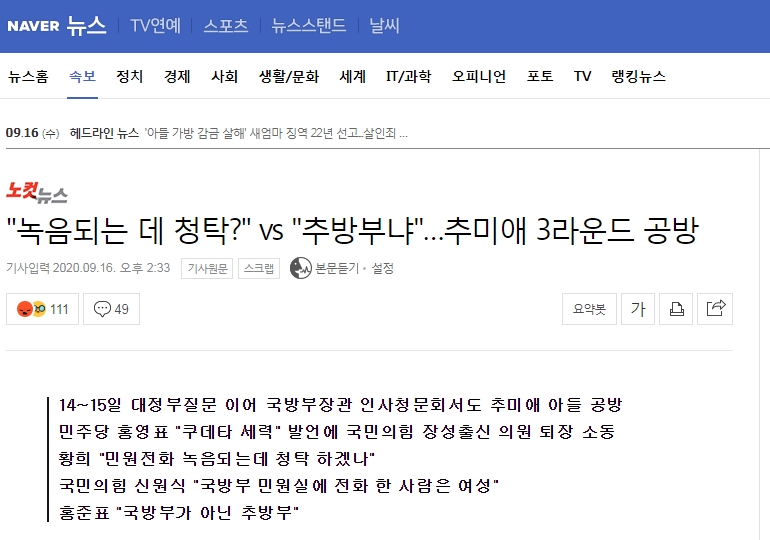 "녹음되는 데 청탁?" vs "추방부냐"..추미애 3라운드 공방 기사에 달린 댓글 반응이다.