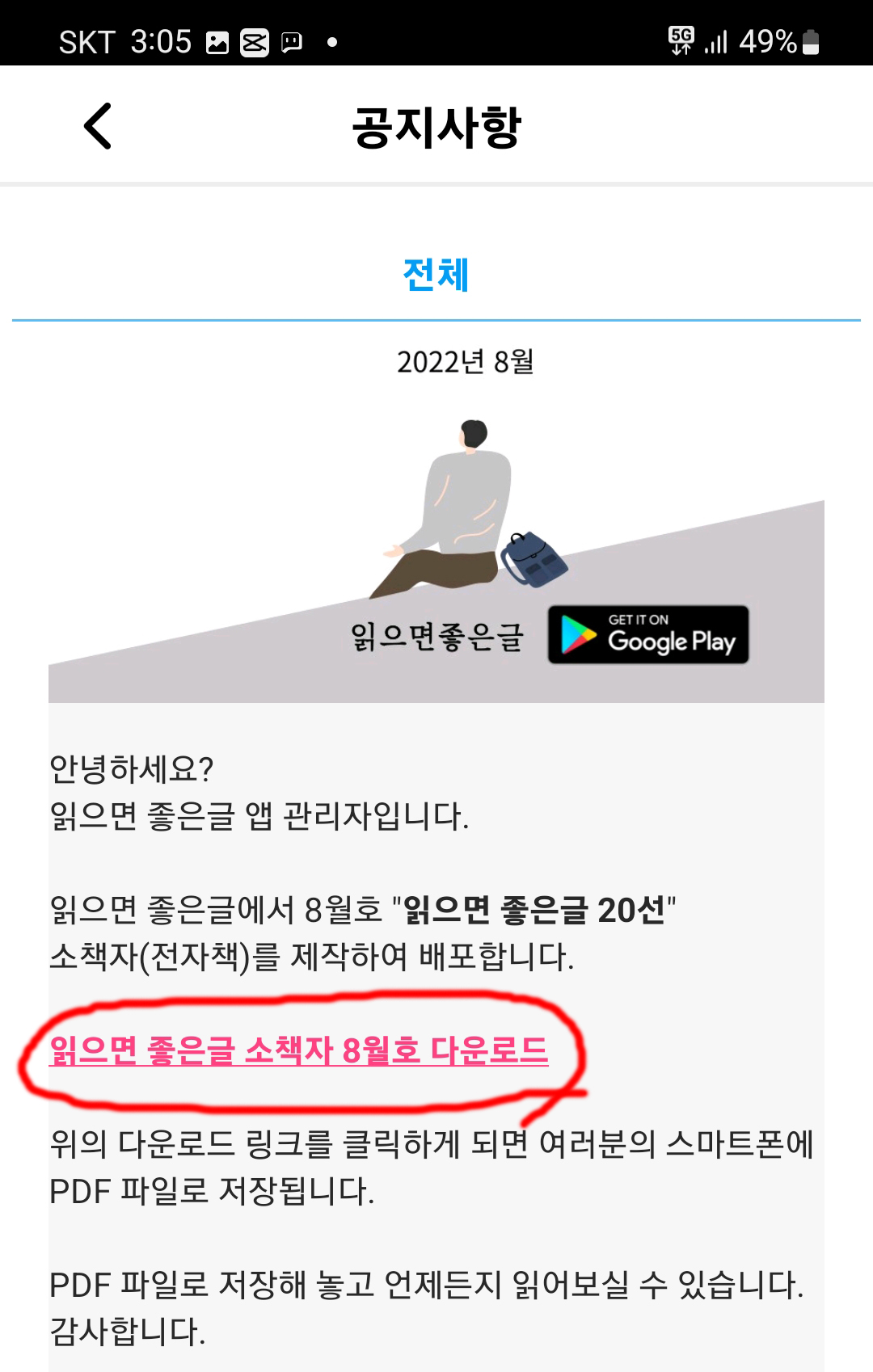 '읽으면 좋은글' 앱을 스마트폰에 설치하셔야 합니다.