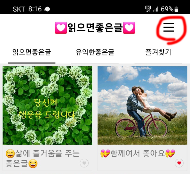 앱을 실행해 보면 상단에 읽으면좋은글, 유익한좋은글, 즐겨찾기 등의 메인 메뉴가 보입니다.