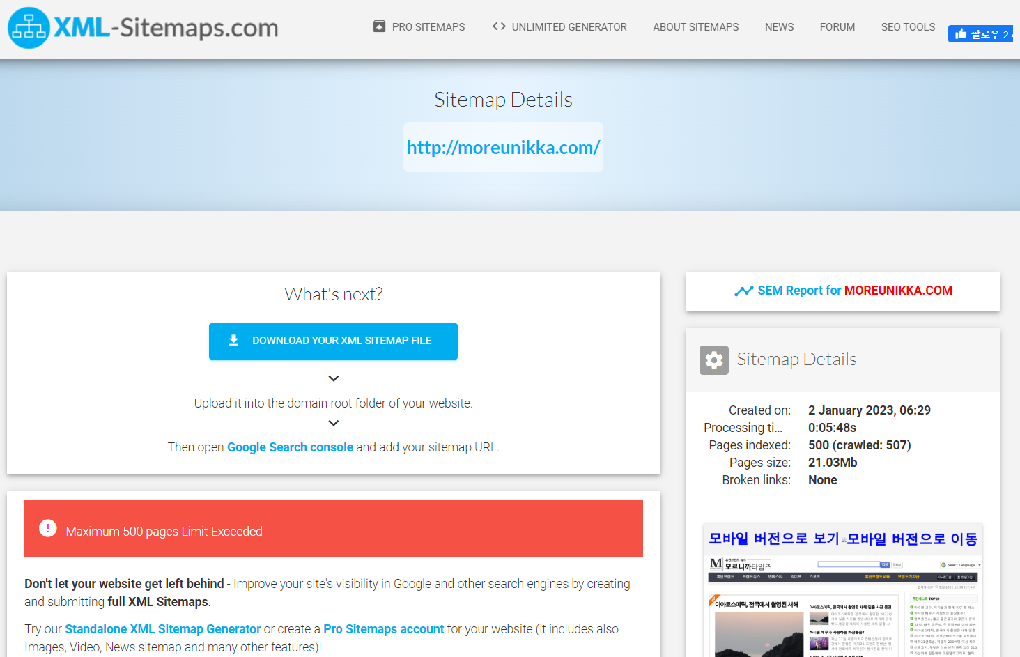 무료 버전은 500개의 url만 색인이 가능하며, 그 이상은 유료 계정을 이용해야 한다.