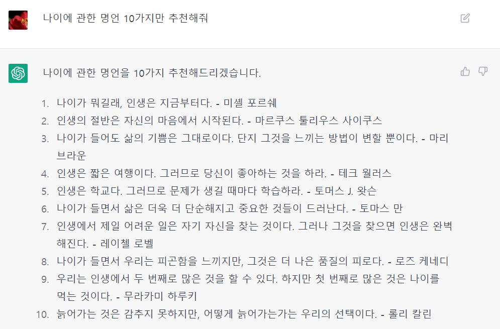 그리고 좋은글 앱을 운영하고 있기 때문에 나이에 대한 명언 10가지만 추천해 달라고 해봤다.