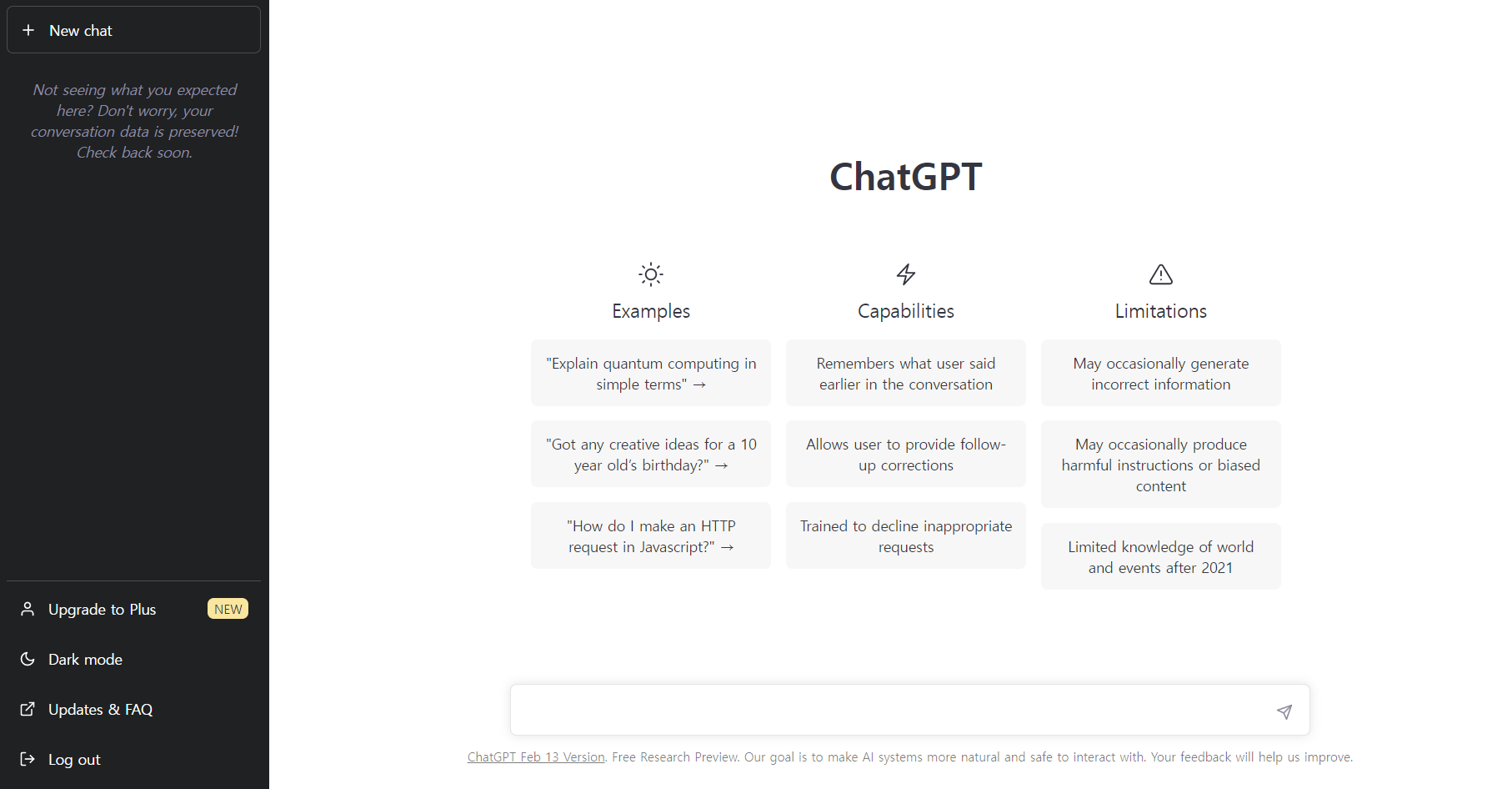 챗GPT에 가입하고 로그인하게 되면 보여지는 화면이다.