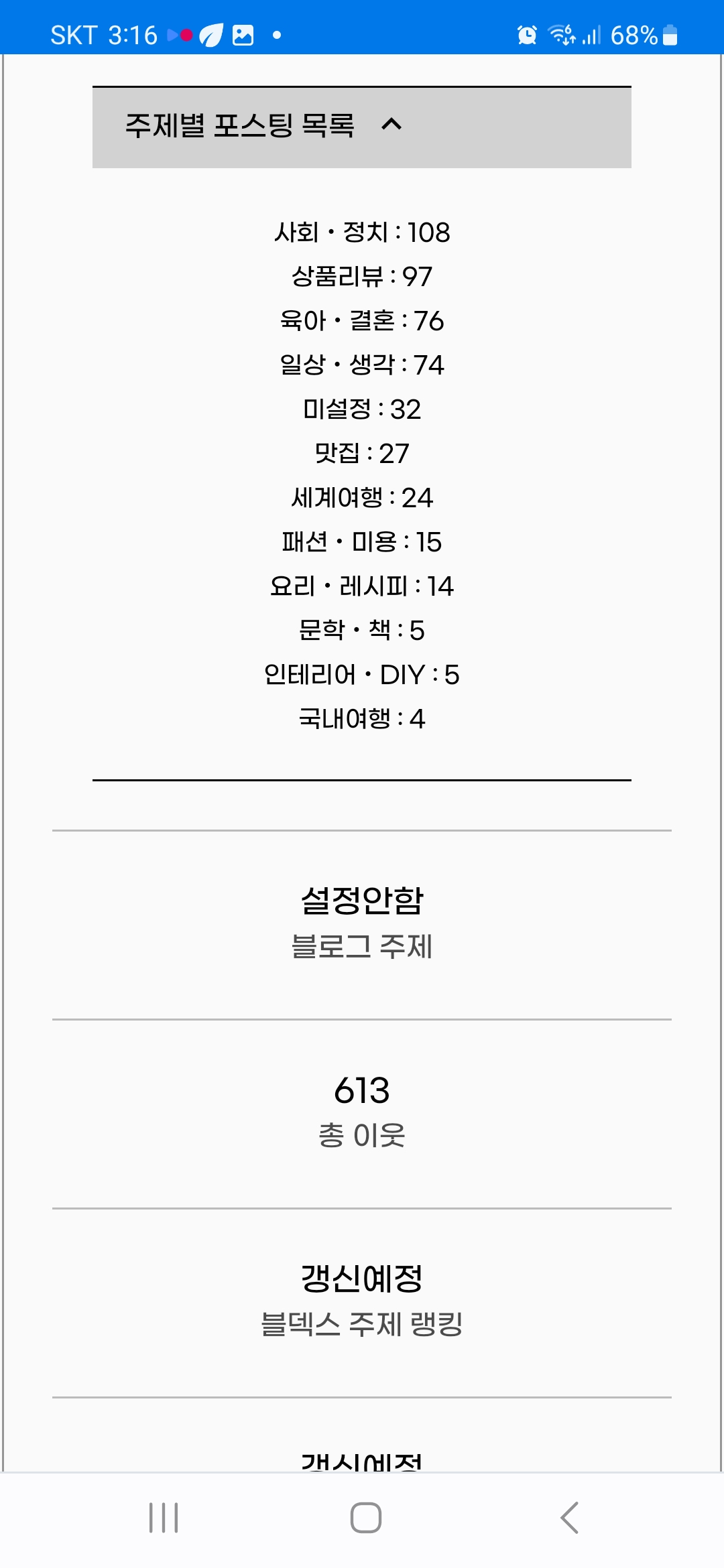 이외에도 다방면으로 블로그를 분석해 준다. 블로그 주제를 분석해 주고 이웃수도 알려준다.