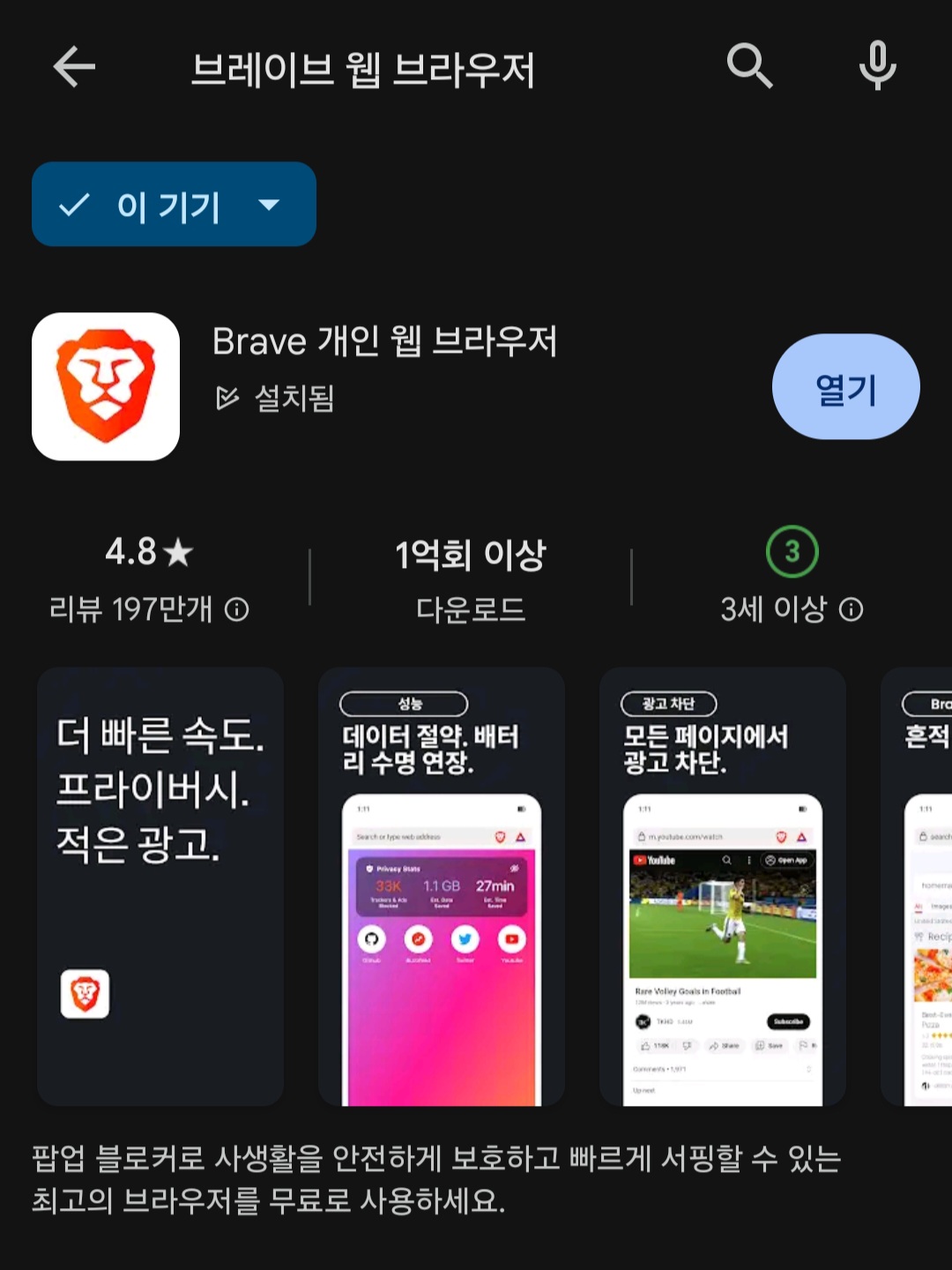 정식 명칭은 "Brave 개인 웹 브라우저"이며, 구글 플레이에서 무료로 다운로드 받을 수 있다.