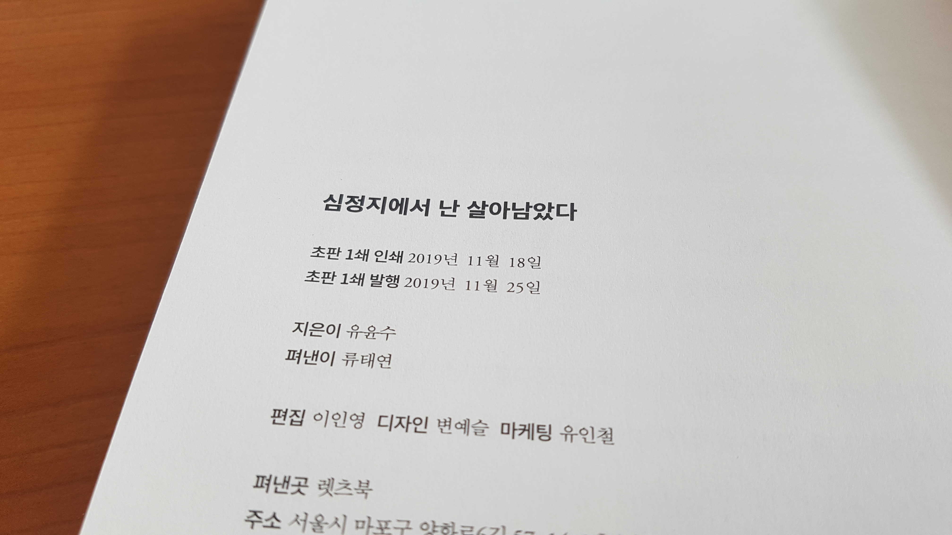 심정지에서 난 살아남았다(유윤수 지음, 렛츠북 펴냄)는 심근경색으로 심정지까지 온 환자의 생환기이다.