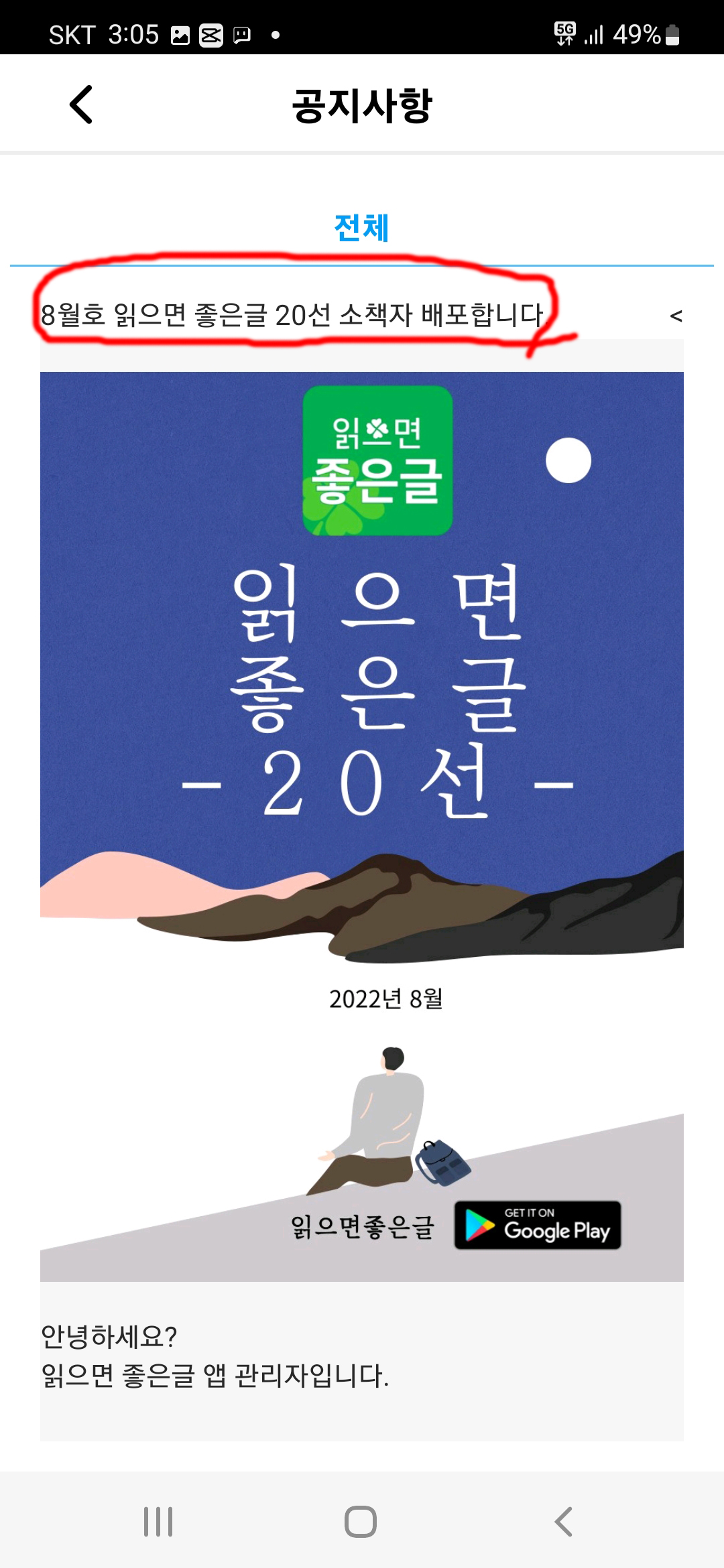 '읽으면 좋은글' 앱을 스마트폰에 설치하셔야 합니다.