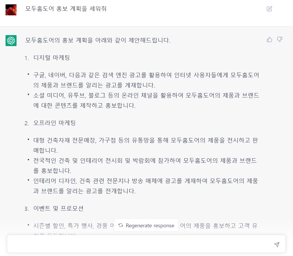 챗GPT가 엄청 똑똑하다고 해서 물어봤다. 모두홈도어 홍보 계획을 세워달라고 말이다.
