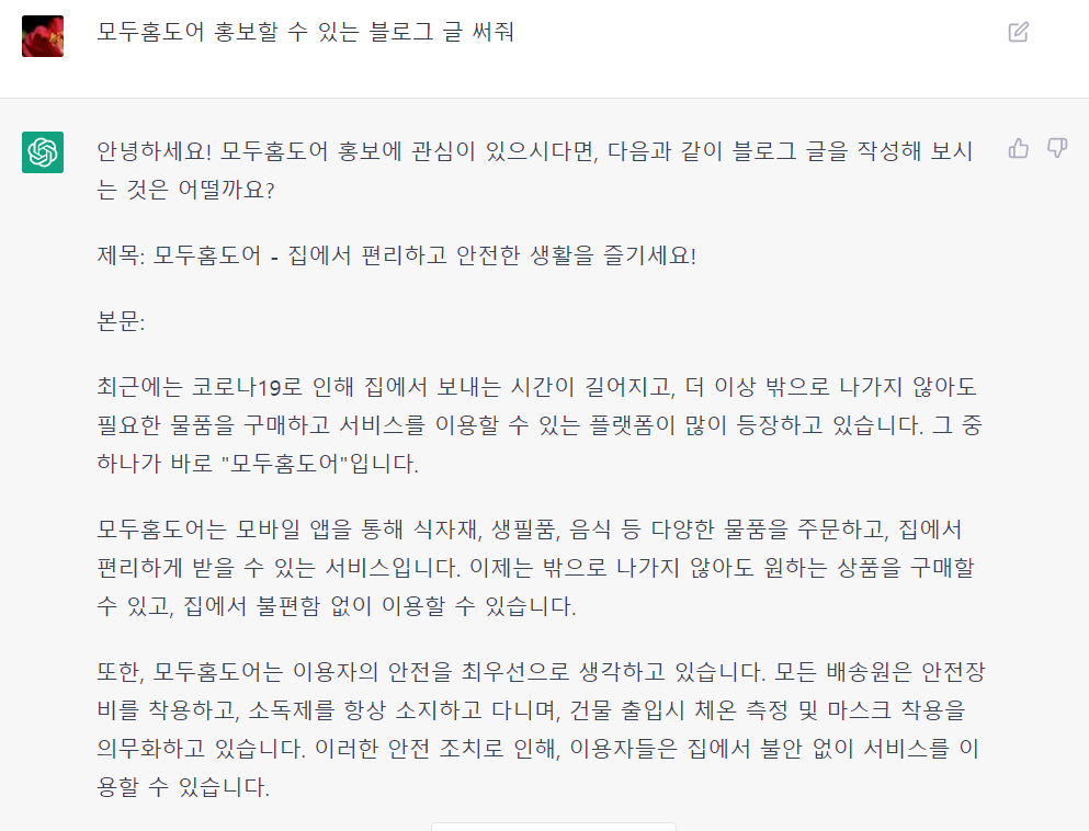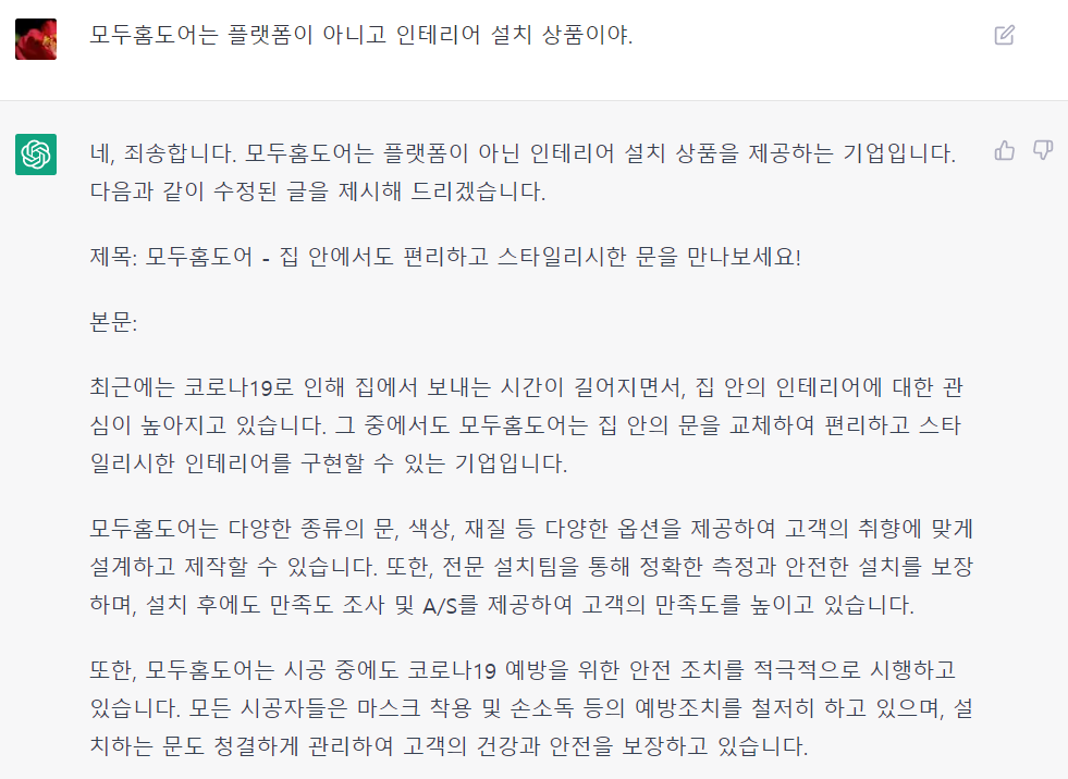 놀랍지 않은가? 챗GPT에게 '모두홈도어는 플랫폼이 아니고 인테리어 설치 상품이야'라고 말해주자마자 곧바로 글을 수정해서 제시해 주었다.