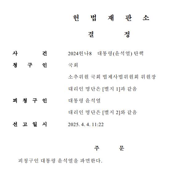 주문, 피청구인 대통령 윤석열을 파면한다.”
