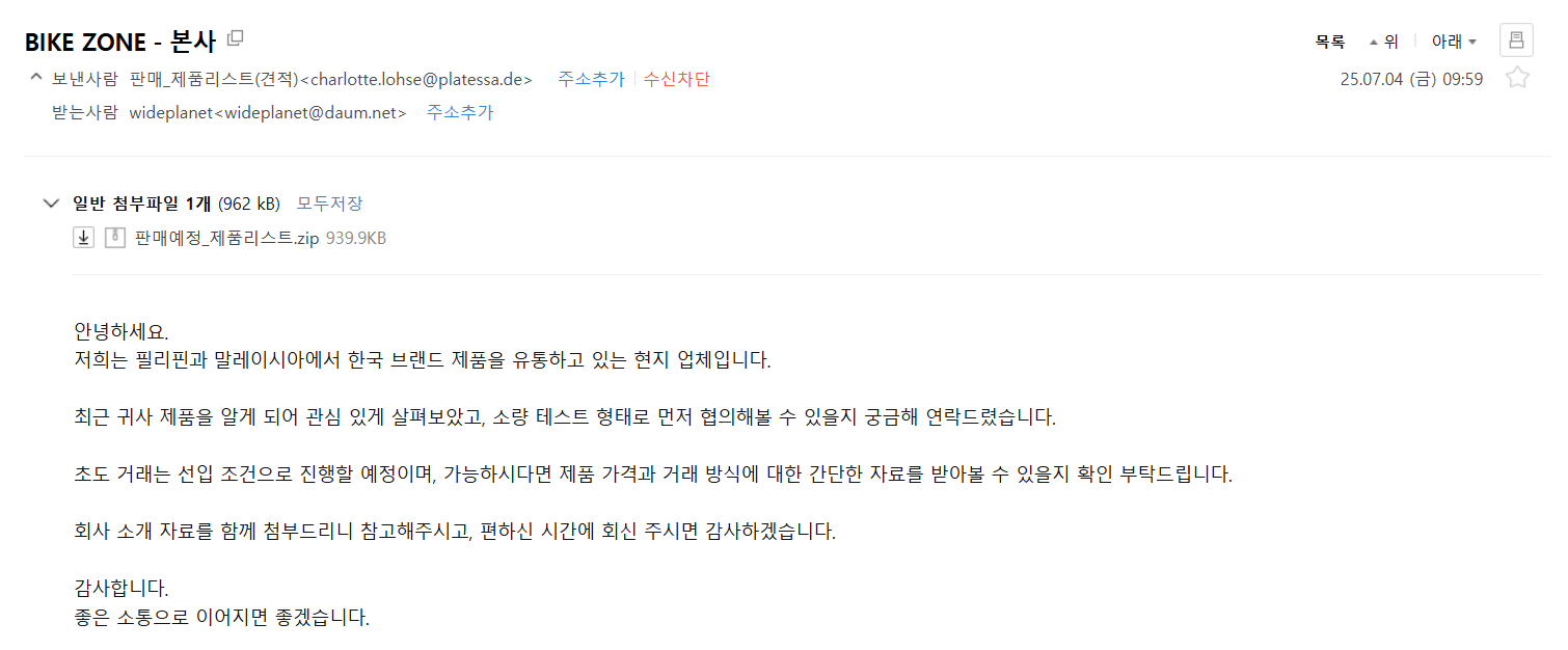 메일을 확인하는 중에 BIKE ZONE 본사에서 보낸 이메일을 확인했다.