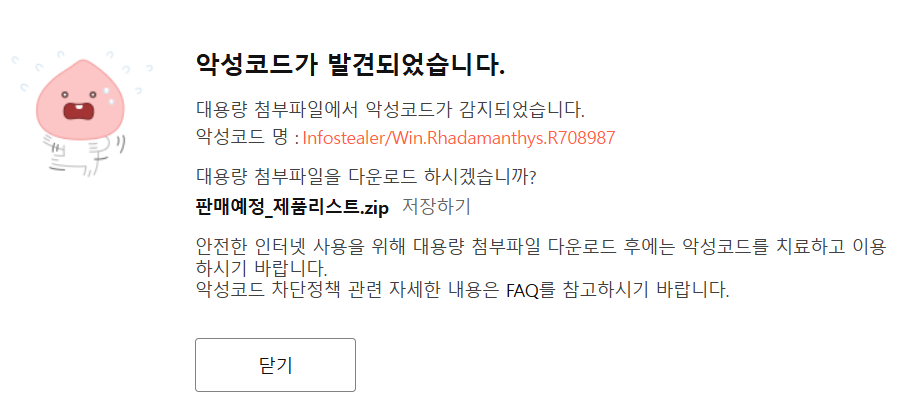 대용량 첨부파일에서 악성코드가 감지되었다는 것이다.
