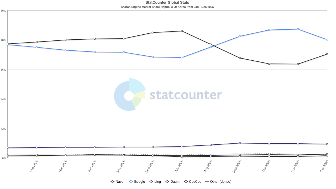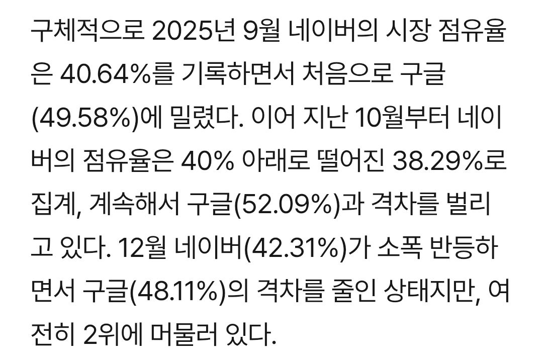 2025년 검색 시장 점유율에서 구글이 1위를 기록하면서 네이버가 2위로 주저 앉았다.