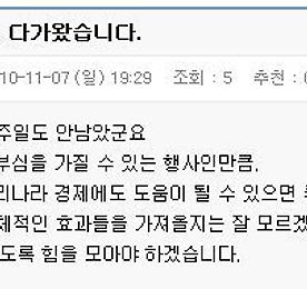 G20 썸네일형 리스트형 G20 홍보 이렇게까지 해야 하나? 이명박 정부는 G20에 모든 것을 걸었나보다. 여기저기 G20 홍보에 열을 올리고 있다. 심지어 아내가 운영하는 여성포탈사이트인 레이디플러스(www.ladyplus.net)에도 홍보글을 올리고 있다. 개인이 운영하는 사이트이고, 회원도 많치 않고, 랭키순위도 47,000위 정도 되는 허접한 사이트이다. 그런데 이 보잘 것 없는 사이트에 홍보 알바까지 동원하면서 홍보글을 올리고 있다. (http://www.ladyplus.net/bbs/board.php?bo_table=i_community&wr_id=55) 누가 봐도 홍보알바가 쓴 글이다. 도대체가 뭐하는 짓인지 모르겠다. G20을 홍보하기 위해 인터넷 홍보알바까지 동원해야 하는가? 이것뿐만이 아니다. TV를 보고 있자니 광고시간까지 활용해서 G20을 홍.. 더보기 G20이 도대체 뭐길레 이리 호들갑이란 말인가? 이명박대통령이 G20을 유치하기 전에 G20 정상회의를 알고 있는 사람이 얼마나 됐을까? 그런데 이제는 전국민이 G20 정상회의를 알아버렸을 것이다. 이명박대통령은 이를 외교적성과로 부풀릴려고 단단히 벼르고 있는 모양이다. 올림픽도 아니고 월드컵도 아니고... 정상회의가지고 이리 호들갑을 떠나? 오늘 지하철에 보니 경찰이 한명씩 배치되어 있더라~ 전경도 몇명 보이는 것 같고... 이렇게 철두철미하게 보안에 신경을 써야 하는 것인가? 아침부터 지하철에서 경찰아저씨를 보니 마음이 별로 안좋더라~ 무엇때문에... 무엇때문에 저 경찰아저씨는 아침부터 지하철역을 지키고 있어야만 하는가? 누구를 위해... 나는 이명박대통령이 추진하고 있는 대운하, 4대강사업 등등 거의 모든 것들을 반대한다. 이제 4대강사업은 돌이.. 더보기 이전 1 다음